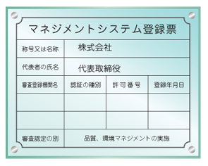 品質,環境マネジメントの国際規格、ISO関連の看板・HACCP承認施設看板の企画製作いたします。国内外のISO認証機関、JACO、JQA、JCQA、MSA、MOODYなどロゴマークをご指定いただけるオリジナルハイクォリティーサインです。 |