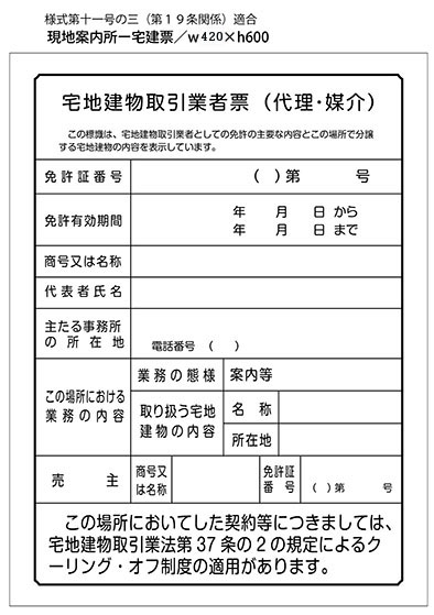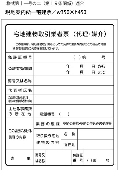 | 宅建業法、様式第十一号・三十号(第十九条関係)の屋外掲示用標識・・・免許番号など会社情報を記入してお届けします。 |