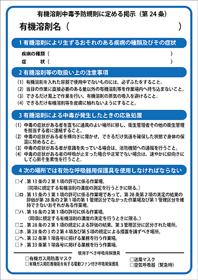 第二十四条 事業者は、屋内作業場等において有機溶剤業務に労働者を従事させるときは、次の事項を、作業中の労働者が容易に知ることができるよう、見やすい場所に掲示しなければならない。 |