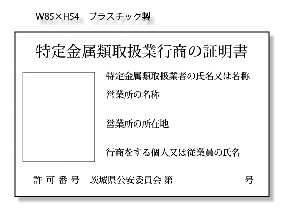 | 同時購入で、名刺サイズの特定金属類取扱業行商の証明書を制作致します。