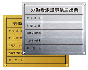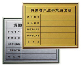 労働者派遣事業者届出票の法令看板、屋外仕様のシルバーゴールドから、本格ステンレスからガラス風,アクリルの許可票までお客様のニーズに合わせて選べます。サイズは縦35cm×横45cmです。 |
