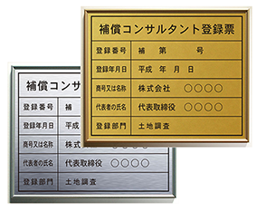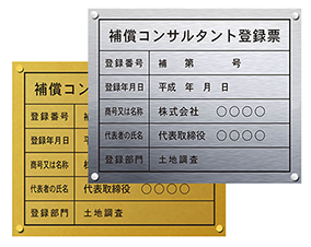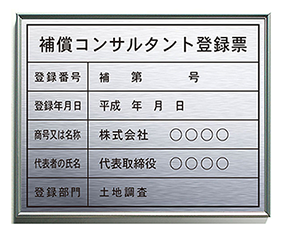 補償コンサルタント登録票の看板、屋外仕様のシルバーゴールドから、本格ステンレスからガラス風,アクリルの許可票までお客様のニーズに合わせて選べます。サイズは縦35cm×横45cmです。 |